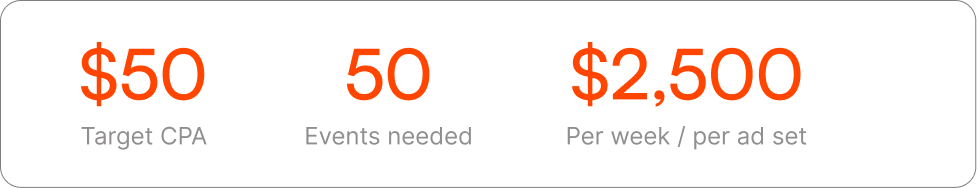 At a $50 CPA, this is the minimum spend to exit learning with no audience signal. Most mid-market brands burn this repeatedly across multiple ad sets.